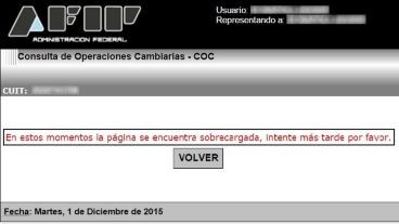 Primero fue: “Vuelva a intentar más tarde”; luego se informaba sobre un error de carga, y finalmente, pasadas las 14, se anunció: “En estos momentos la página se encuentra sobrecargada, intente más tarde por favor”. Recién por la tarde la web de la Afip volvió a alivianarse y a otorgar autorizaciones.