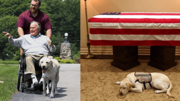 En la imagen se ve al animal acostado junto al ataúd cubierto por una bandera estadounidense.