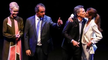 Así, Karina Rabollini se mostró con Daniel Scioli y Juliana Awada con Mauricio Macri. Scioli y Rabollini se mostraron sobrios. Macri y Awada algo más cariñosos, con algunos piquitos incluidos.