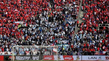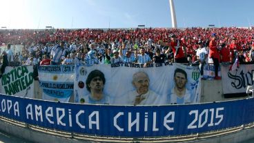 1 de 3 | Todos locales con sus banderitas, menos un sector de hinchas argentinos. (Télam)2 de 3 | Locales y visitantes, mezclados en la platea del Nacional de Santiago. (Télam)3 de 3 | Diego, Francisco y Messi; el trapo que se coló en el Nacional. (Télam)