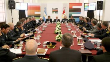 El gobernador Miguel Lifschitz y el ministro de Seguridad, Maximiliano Pullaro, se reunieron este viernes en Rosario, con la plana mayor de la policía de la provincia de Santa Fe, con el objetivo de “impartir directivas” de trabajo, y conocer las “necesidades y demandas” de los uniformados.