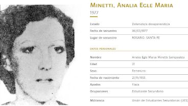 Analía Minetti era militante de la organización Montoneros. Fue secuestrada en la ciudad de Rosario, detenida en el ex Servicio de Informaciones y asesinada por el terrorismo de Estado en 1977. La Secretaría de Derechos Humanos, a través del equipo de Investigación, Apoyatura y Seguimiento de Causas Judiciales de Lesa Humanidad, aportó datos a la investigación que derivó en su identificación.