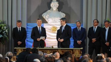 También los titulares de Transporte, Guillermo Dietrich; de Justicia y Derechos Humanos, Carlos Garavano; de Seguridad, Patricia Bullrich; de Trabajo, Empleo y Seguridad Social, Jorge Triaca; de Desarrollo Social, Carolina Stanley; y de Salud, Jorge Lemus, en un acto realizado en el Salón del Bicentenario de la Casa de Gobierno.