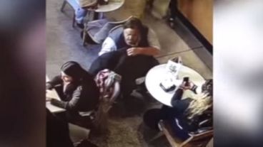 En el video se observa a la pareja sentándose a una mesa y al hombre haciendo su clásico movimiento de arrojar la campera sobre el objeto que va a robar.