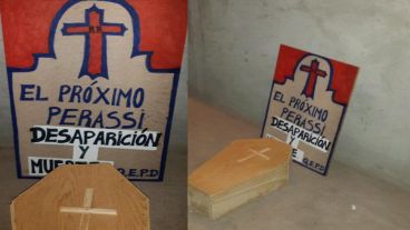 El miembro de la Asociación de Taxis de San Lorenzo, Rubén Reide, quien acompañó desde el primer momento de la desaparición de Paula Perassi a la familia, encontró este miércoles por la mañana frente a su casa un cajón y una lápida de cartón que contiene la frase “Próximo Perassi, desaparición y muerte”.