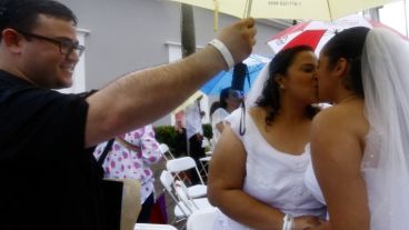 Las más de sesenta parejas fueron casadas por 23 líderes de distintas congregaciones religiosas frente a la sede de la Compañía de Turismo de Puerto Rico, agencia que promueve la isla caribeña como destino internacional de bodas para personas del mismo sexo.