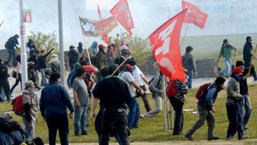 Según publicó el diario Río Negro, cerca del mediodía un grupo de manifestantes opuestos al convenio comenzó a derribar las vallas, por lo que la policía reaccionó con gases lacrimógenos que fueron respondidos a pedradas.