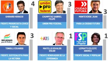 El reparto de ediles por fuerzas quedó así: Frente Progresista cuatro, PRO tres, Ciudad Futura tres, FJPV tres, Frente Renovador uno, y Frente Social y Popular uno (ver imagen).