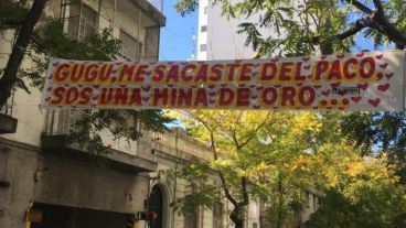 Un pasacalle en el centro de Rosario conmueve a un periodista, que le toma una foto y la comparte en Twitter. “Gugu, me sacaste del paco. Sos una mina de oro”, se puede leer contra el cielo recortado de edificios y cables cruzados.