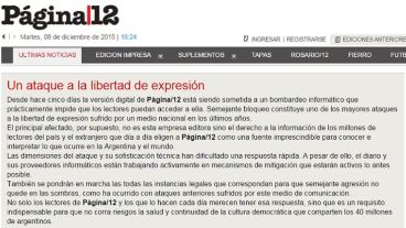 “Desde hace cinco días la versión digital de Página/12 está siendo sometida a un bombardeo informático que prácticamente impide que los lectores puedan acceder a ella. Semejante bloqueo constituye uno de los mayores ataques a la libertad de expresión sufrido por un medio nacional en los últimos años”, afirmaron en un comunicado que se puede leer este martes a la tarde.