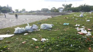 La plaza estaba cubierta de restos, entre ellos, botellas vacías, cajas y papeles. La Municipalidad de Rosario debió disponer de 10 empleados para limpiar la zona y dejarla en perfectas condiciones.