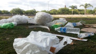 Un papelón. La plaza Che Guevara amaneció plagada de papeles, botellas y residuos varios tras una noche de recital. Lamentablemente, el público que asistió no tuvo reparo en usar los cestos o bien, llevarse los restos para luego tirarlos correctamente.