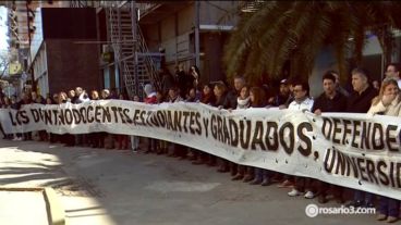 En el acto realizado en las facultades de Santa Fe y Vera Mujica se planteó el apoyo de toda la comunidad educativa con un extenso pasacalle que decía: “Docentes, no docentes, estudiantes y graduados defendemos la universidad pública”.