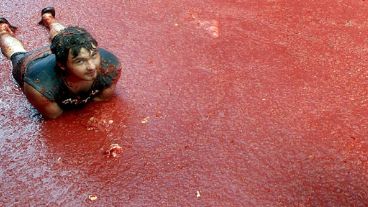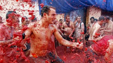 Más de 40.000 personas llegadas de diferentes países se bañaron hoy en tomate para celebrar la fiesta de la Tomatina, una "atípica" batalla con la que la localidad española de Buñol rememora una tradición que comenzó hace 63 años como una mera diversión entre amigos.