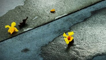 Por el suelo. Allí se puede ver algo de primavera, flores y hojas que el viento dejó desparramados. Las veredas también muestran los restos de una llovizna fina que cayó en la madrugada. El cielo promete una nueva jornada gris y con agua.