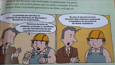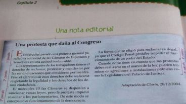 En las páginas del ejemplar se puede ver que una de las actividades propuestas incluye un editorial del diario Clarín que fue adaptado y tomado como ejemplo para señalar objeciones a la protesta gremial.