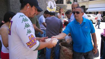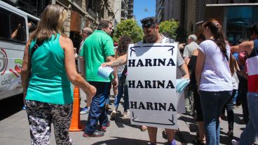 El particular reclamo se llevó a cabo en Corrientes y Córdoba, donde muchas personas hicieron una larga fila para recoger el pan que regalaron los comerciantes.