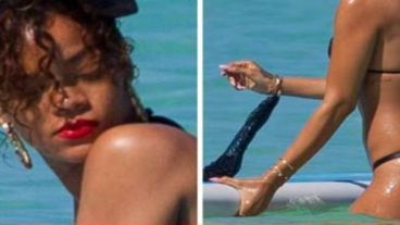 Rihanna eligió un bikini de color negro para flotar en una tabla cerca de la playa. La cantante pasó un largo rato a la deriva sin que el traje de baño cediera a las presiones.