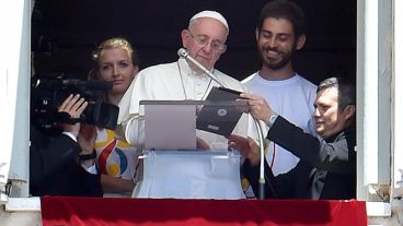 El pontífice invitó a dos jóvenes a acompañarlo en la ventana del Palacio Apostólico desde la cual ofició, como es habitual los domingos ante la multitud que se congrega en la Plaza de San Pedro y mostró el dispositivo