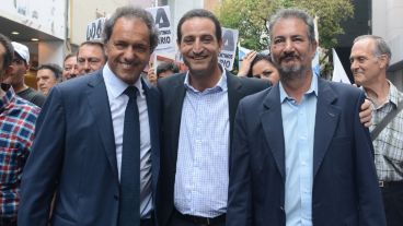 El precandidato a intendente por el Frente Justicialista para la Victoria, Roberto Sukerman, junto a su primer aspirante a concejal, Alberto Muñoz, acompañaron al gobernador de la provincia de Buenos Aires y precandidato presidencial, Daniel Scioli, en su visita a Rosario durante la cual dialogaron sobre los alcances de la implementación de la Policía Municipal, entre otro temas.