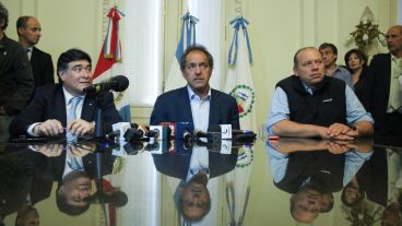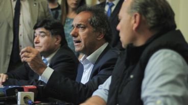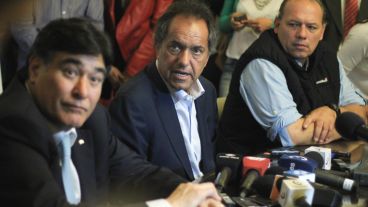 El candidato presidencial del Frente para la Victoria, Daniel Scioli, se reunió este miércoles con la intendenta Mónica Fein para presentar sus propuestas para Rosario. El encuentro en el Palacio de los Leones se desarrolló en la misma sala donde por la mañana estuvo la postulante a la vicepresidencia de Cambiemos, Gabriela Michetti. El gobernador bonaerense estuvo junto a su compañero de fórmula, Carlos Zannini, y al secretario de Seguridad de la Nación, Sergio Berni.