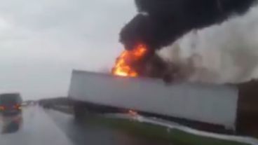 Un camión sufrió un incendio en la tarde de este lunes luego de chocar con otro vehículo, tirarse a la banquina y volcar.