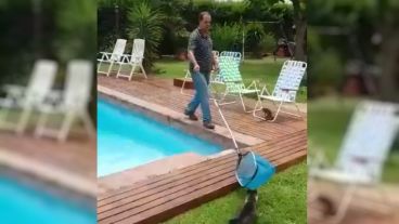 El video comienza con la imagen de un hombre que intenta sacar una iguana de tamaño importante de su pileta. La mujer lo graba y lo felicita: “La salvaste, muy bien”.