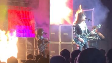 El imitador de Paul Stanley, vocalista de la banda de rock estadounidense, demostró además plena confianza en su equipo, que intentó dos veces (primero un músico y después un auxiliar) rescatarlo del avance de las llamas.