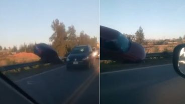 La imagen del vehículo que terminó suspendido en la barrera de metal fue grabada por varios conductores que transitaban por el lugar.