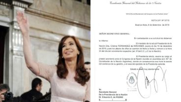 "El mandato de Cristina Kirchner expira el día 10 de diciembre de 2015 a la hora 24”. Y agrega: "Siendo en consecuencia esa hora la exacta del comienzo de su gestión y el cese del ejercicio de la presidenta saliente".