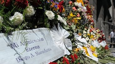 El féretro iba envuelto en una bandera argentina con una rosa encima, mientras algunas personas colocaban flores y camisetas y banderines de diferentes clubes de fútbol sobre el coche fúnebre.