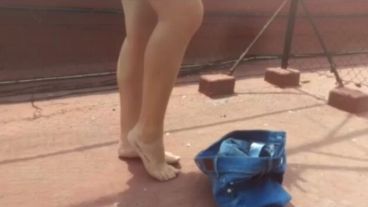En casi dos minutos, la joven muestra cómo mueve sus piernas para elevar los pantalones entre sus piernas. Finalmente, logró ponérselos.