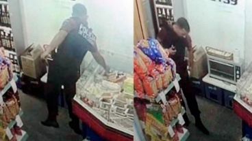 El video, de apenas 13 segundos, fue grabado por la cámara de seguridad del supermercado y muestra como el policía, vestido de uniforme con su chaleco antibalas con identificación de la fuerza y pistola reglamentaria, elige un artículo de la fiambrería.