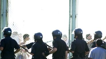 Luego de que rompieron el alambrado, efectivos de la Policía Federal ingresaron al campo de juego y realizaron disparo de balas de goma además de lanzar gases lacrimógenos para intentar controlar la situación. Los incidentes se produjeron cuando ambos equipos estaban en la cancha para iniciar el encuentro.