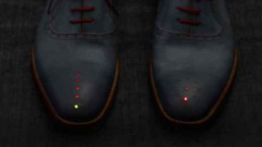 Confeccionados en cuero y con suela de madera –el diseño no es lo más llamativo–, estos zapatos están aún en etapa de trabajo. Si bien a simple vista no despiertan curiosidad, el dato distintivo son las dos líneas de leds que aparecen en las punteras: la barra izquierda indica la dirección, mientras que la derecha marca la cercanía con el objetivo.