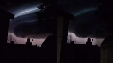 En una escena cinematográfica se ve cómo, ya de noche y en medio de una tormenta eléctrica, el hidrometeoro surca el cielo de la ciudad.