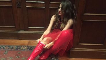 En la seguidilla de imágenes, Carolina Ardohain luce con unas bucaneras rojas, una pollera de tul al tono, una campera de cuero y un body negro.