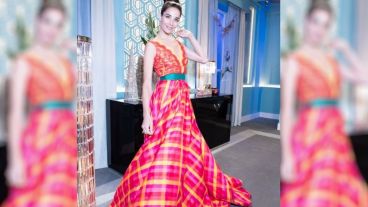 La nieta de La Chiqui lució un nuevo diseño de Bogani que consistió en un top escotado y un short de encaje en amarillo y bermellón con una sobrefalda escocesa al bies; todo con mucho vuelo.