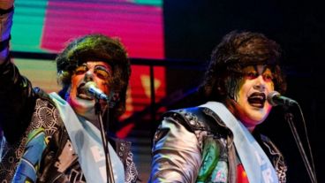 En la presentación, los integrantes de la agrupación lucieron, además de los trajes y maquillaje del show, pelucas que emularon el corte de cabello del mandatario argentino.