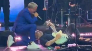 Mientras entonaba el tema "Lo que fui es lo que soy", el vocalista chocó con su guitarrista y lo tiró al piso. Michael Ciro –quien además es director musical de Sanz– no dejó de tocar en ningún momento. El episodio no tardó en volverse viral.
