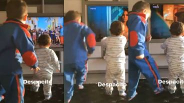En las imágenes que posteó la rosarina se ve a Thiago, de cuatro años, y Mateo, de uno, vestidos con sus pijamas y moviéndose al ritmo del hit frente a una tele que reproduce el clip del hit de Luis Fonsi y Dady Yankee.