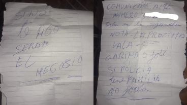 Carina explicó que de los cinco comercios, solo uno se comunicó al teléfono que sugieren las notas extorsivas. "Piden un millón de pesos, 300 mil. Tuvimos que cerrar los locales y estamos sin trabajar. Esto es un caos", concluyó.