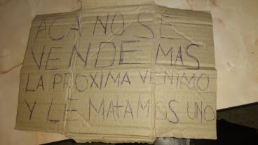 "Acá no se vende más. La próxima venimos y le matamos uno". Esa amenaza escrita en birome sobre un trozo de cartón fue arrojada en la puerta de la casa de Nogues al 400 antes de atacarla a balazos. El hecho quedó filmado en la cámara de seguridad de la cuadra, donde se puede ver a los agresores disparando mientras se desplazan en moto a contramano.
