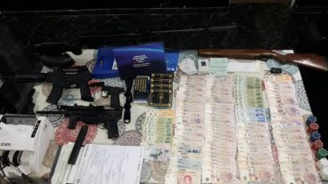 En el domicilio se secuestraron fichas de juegos de valores varios, naipes y dos mesas de paño se halló una pistola ametralladora calibre 9 milímetros con cargador; una caja de 38 municiones intactas calibre 40, un cargador del mismo calibre con 13 municiones intactas; una carabina calibre 22 largo con mira telescópica y cargador con 8 municiones intactas; un rifle de aire comprimido con mira telescópica y dos carabina calibre 5.5 con bípode.