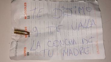 La tensión aumentó este martes por la mañana, cuando el hombre encontró un papel debajo de la puerta donde le decían: "Te dijimos que te vayas la concha de tu madre". El papel tenía una bala pegada con cinta.