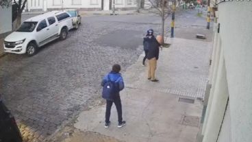 En las imágenes de una cámara de seguridad de la cuadra quedó registrado el momento del robo. Los ladrones pasaron junto al padre y su hijo, uno bajó del rodado y apuntó con su arma para exigirle al hombre que entregara el celular.