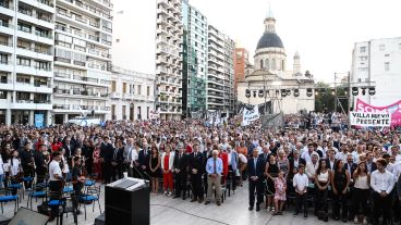A las 19.30, Javkin dejó el Concejo y subió al Propileo del Monumento. Lo esperaba un acto muy bien montado. Otra vez la prolijidad, la organización (o el respeto y el control, en términos de la nueva gestión). Después de la orquesta de barrio Ludueña, el intendente volvió a hablar. Esta vez leyó su mensaje oficial porque "cada palabra es importante".