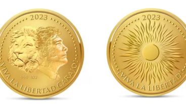 De un lado, el rostro de Milei de perfil y con el mentón en alto, y su cabello entrelazado con la melena de un león que completa el corazón de la moneda. Alrededor, el lema “¡Viva la libertad carajo!” y, en el reverso, un sol radiante.