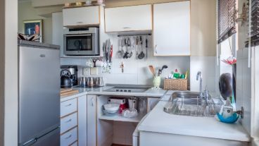 Lo principal es separar la cocina en tres: la zona del agua (donde debe estar la bacha/pileta y el secaplatos); la zona del fuego (donde estará la cocina/horno y un pequeño espacio para colocar los recipientes que se pongan y saquen del fuego) y la zona de preparación de alimentos (una pequeña mesada, que puede incluso ser una pequeña isla separada del resto de los muebles).