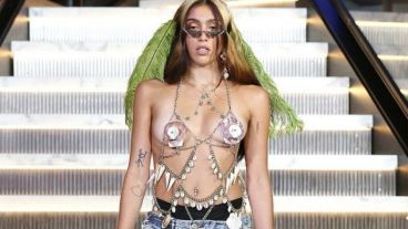 La hija de Madonna desfiló un top de caracoles y cadenas que dejaban entrever sus lolas. Debajo, llevaba un jean estilo boyfriend recortado a partir de la rodilla, que dejaba ver su culotte negro y los pelos en sus piernas. Además de plumas verdes en la cabeza, Lourdes lucía unas gafas “cat eyes” y unas zapatillas grandes, con cámara de aire, que serán furor esta temporada.
